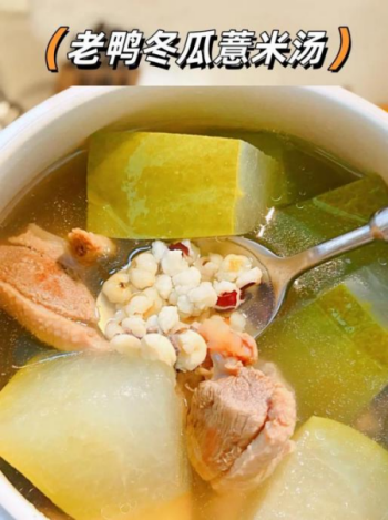 做法:将老鸭焯水后,与冬瓜块、泡好的薏米、姜片、陈皮一同放入锅中炖煮 1.5 - 2 小时,最后加盐调味即可。