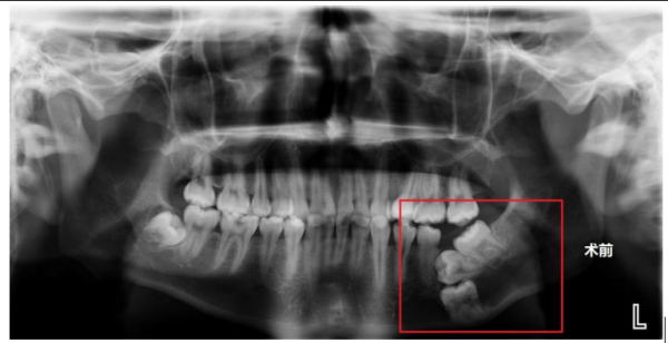 术前X片显示,右下颌骨内没长出来的三颗磨牙呈“叠罗汉”状埋伏