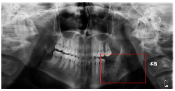 术后X片显示,被囊肿侵蚀的颌骨缺损区已成功植入人工骨材料