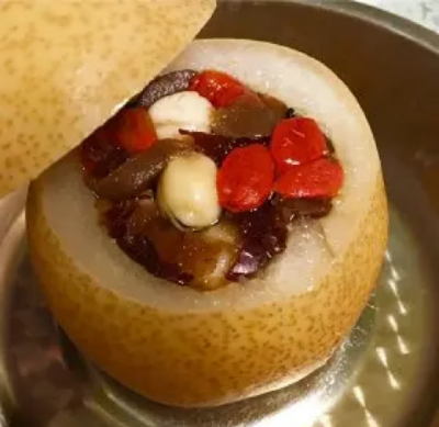 做法:莲子洗净泡软,荸荠去皮切小丁;梨洗净,顶端 1/4 处切开留盖,挖核成梨罐;将荸荠丁、川贝粉、红豆沙、莲子拌匀作馅心,填入梨罐盖好;放入碗中,加冰糖和少许水,上锅蒸 40 分钟。