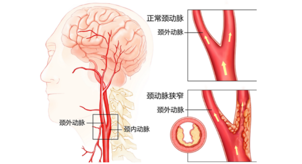 颈动脉内大量斑块导致狭窄后血流严重受阻,大脑缺血发生脑梗死