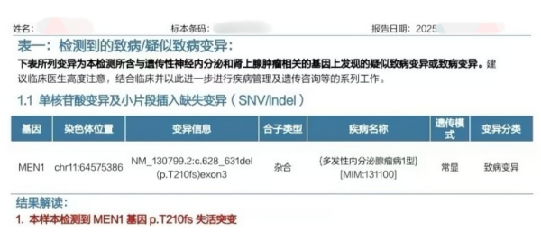 为明确诊断,王军进一步完善检查。血液检测发现胃泌素升高,提示可能存在胃泌素瘤;全身PET-CT扫描显示,全身多处骨质破坏、右肺中叶类癌、双侧肾上腺增生,还有需排查的嗜铬细胞瘤和胃泌素瘤,同时确认了甲状旁腺腺瘤和面部血管纤维瘤。此外,王军透露父亲和兄长均因胃部疾病过早离世,存在家族病史。最终,基因检测结果确诊王军患有多发性内分泌腺瘤病1型(MEN1)。这一诊断,不仅解释了他身上多种肿瘤并存的原因,也揭示了家族成员早逝的遗传根源。