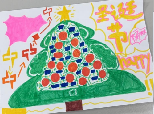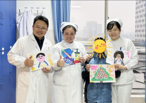 画里的主角不是别人,正是这些天悉心照顾他的泌尿外科二区医护人员。画纸上,扎着辫子的护士姐姐笑容亲切,戴着眼镜的医生叔叔头顶仿佛有“光环”,旁边还有一棵特别的圣诞树,树上挂着的不是传统装饰,而是陈宸用稚嫩笔触描绘的“暖暖的针”和“甜甜的药”,旁边甚至点缀着象征“打败病菌”的卡通魔法符号。