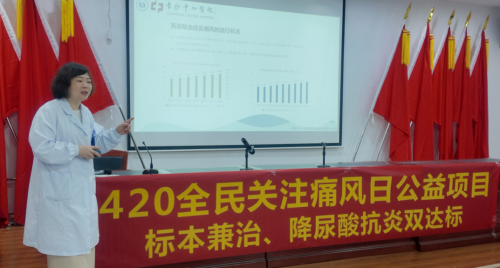 肾病、风湿免疫科专家团队走进雨花区黎托街道阳河社区,举办“走进痛风”科普讲座及义诊活动,为居民送上健康知识与免费检测。