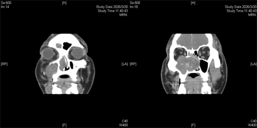 鼻窦CT检查结果触目惊心:患者鼻腔鼻窦内肿瘤约7.0厘米×5.0厘米(约鹅蛋大小),呈膨胀性生长,已侵犯颌面部皮下、眶内,破坏上颌窦骨质,甚至侵及对侧鼻腔,病情十分凶险。