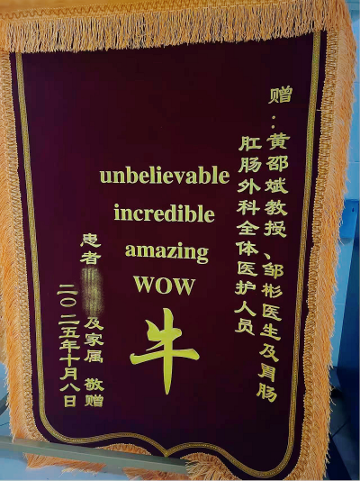 黄邵斌主任、邹彬医生带领团队,第一时间全面评估,量身定制出科学稳妥的治疗计划。手术顺利完成后,科室全体医护人员日夜守护,从术后治疗、伤口护理到心理疏导,每一个细节都倾注了无限用心。老人最终顺利出院,家属激动得不知如何表达感激,定制了一面“画风清奇”的锦旗:满屏语气惊叹的英文“unbelievable, incredible, amazing, WOW”,再加一个顶天立地的“牛”字。