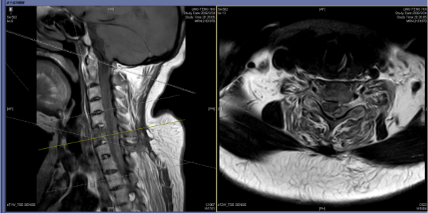 颈脊髓损伤的救治黄金时间为损伤后6—8小时。患者转入脊柱外科二区后,科主任曾浩博士团队立即开启紧急救治通道,经过2天的脱水、激素冲击等对症支持治疗后,张阿姨神经功能有所改善,但危机并未解除。张阿姨长达30余年的强直性脊柱炎导致其颈椎严重僵硬前屈,下颌距胸骨上端仅2-3cm。此次摔倒造成其第5、6节段C6三柱骨折并脱位,颈胸段广泛硬膜外血肿,手术势在必行