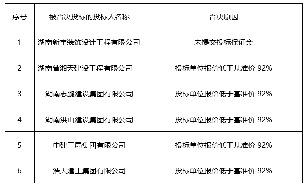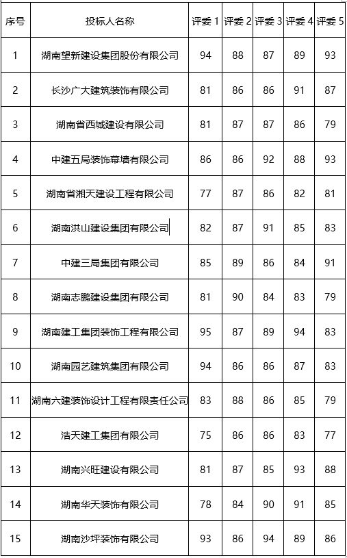 中标候选人名称 | 联合体牵头人:湖南建工集团装饰工程有限公司,联合体成员:湖南省第四工程有限公司 | 联合体牵头人:长沙广大建筑装饰有限公司,联合体成员:湖南顺天建设有限公司 | 联合体牵头人:湖南沙坪装饰有限公司,联合体成员:湖南省沙坪建设有限公司 | |