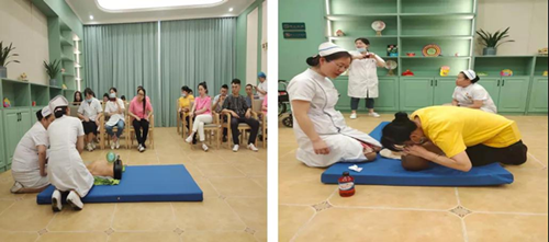 随后,盘婧婧、刘群两位护士长向老年公寓的工作人员讲解心肺复苏的重要性及急救流程,通过急救操作演示教大家掌握急救技能,并让大家依次操作演练,并对每名参与者心肺复苏操作心脏按压的位置、力度、频率进行了重点指导,向大众普及急救知识。
