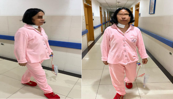 术后麻醉科给患者实施病人自控镇痛泵,病人可以根据自己感受,自行控制镇痛泵泵入速度。在无痛条件支撑下,叶女士术后第一天就在护士的指导下开始下床活动。术后第二天,下床活动轻松自如,也拔除了胃管,开始进清流质饮食。普外科每天定时协助患者拍背排痰,进行踝泵运动,鼓励其吹气球,使得术后恢复效果快,没有出现并发症。这也让叶女士感慨道:“我之前听别人说这么大的手术,起码要在床上躺一个星期。但是我现在不但能下床活动,疼痛感也不明显”。在经过抗炎、补液、营养支持等对症支持治疗,术后不到一周的时间,叶女士能够活动自如,并且即将出院。