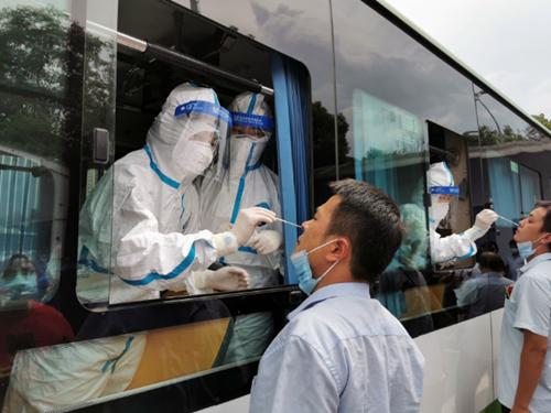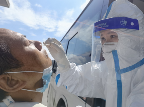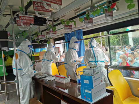在各个核酸采集点,临时安排腾空的公交车成为了她们特殊的“阵地”。健康管理中心的“娘子军”冒着酷暑,穿着密不透风的防护服、戴着面罩,声音早已沙哑。手消毒、取拭子、俯身、采样、装管、快速而准确地留取标本,成百上千次地操作后手臂早已酸痛。防护服里衣服湿了干、干了又湿地循环着,手上的动作却从不曾放缓。她们心里只有一个念头:“我们快一点,公交司机们等的时间就短一点,市民们的出行就更便捷一点”。