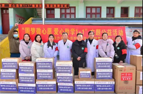 2、积极开展助困助学活动。每年组织志愿者到结对帮扶单位举行学雷锋活动。今年1月,在院领导带领下,中心志愿者带着满满的爱心物资,抵达怀化通道县大高坪苗族乡,开展“圆梦微心愿 爱心助学1+1”主题公益活动。这是自2006年“医校”牵手以来,中心第四次派志愿团队到该校开展公益活动。