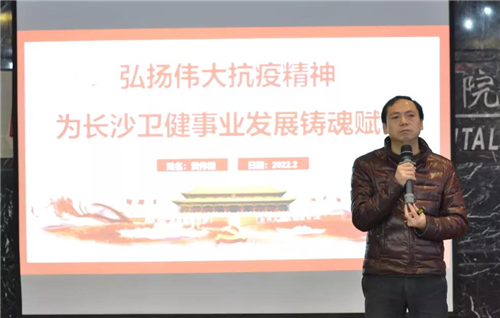市卫健委党建处处长黄伟德以《党建聚合力——弘扬伟大抗疫精神 倡响卫健系统党建文化主旋律》为题,结合视频分享、诗歌朗诵等形式,从形成背景、基本内涵、重要意义和现实转化等方面动情阐述了伟大抗疫精神。