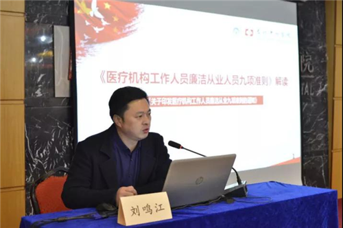 党委副书记、副院长刘鸣江详细解读了《医疗机构工作人员廉洁从业九项准则》,带领学员从制定背景、适用范围、主要内容和亮点等方面对《九项准则》进行了全面学习。