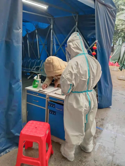 ,和值晚班的同事周霄霄打了招呼后,我去值班室小憩了一下,很快就到了上班的点了。夜班要从零点值班到八点,意味着我穿上防护服后这八个小时不能喝水、不方便上厕所。夜里发热的患者也不少,复测体温、询问流行病学史、采核酸、抽血.....一项项工作让人没有停歇的时候,尽管夜里温度很低,穿着防护服忙碌的我还是汗湿了后背,贴在身上凉飕飕的。