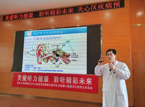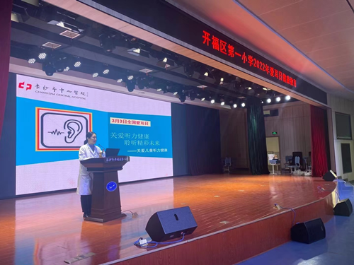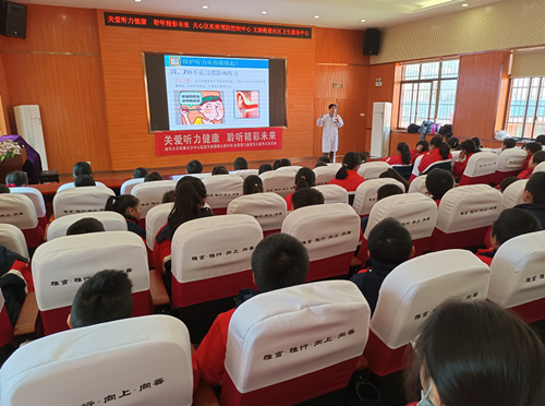 3月2日下午2:30, “爱耳护耳”讲座第二站来到开福区第一小学,耳鼻咽喉头颈外科副主任医师王蔓菁为四、五年级200余名学生再次科普了听力健康知识,并于课后由耳鼻咽喉头颈外科医师团队为每一名学生认真检查了耳朵。