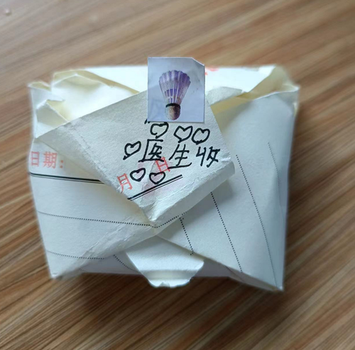 “谢谢白‘依’天使,出门要戴口罩”“小天‘始’”……三张画着精美图案、写着字的感谢卡映入眼帘。“这是几个孩子一起制作的,是他们共同的心意,真的特别感动!”胡文涛说,感谢卡虽然有涂改,还夹杂着错别字,但稚嫩的笔迹却处处透着温暖,字里行间都带着浓浓的感恩之情。“爱出者爱返,我很庆幸自己能一直在做着这样有意义的工作,帮助别人时也被人感动着!”胡文涛说。