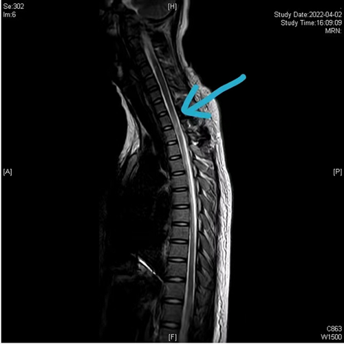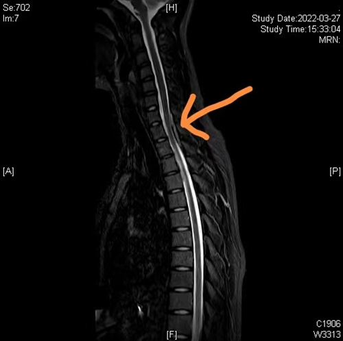 术前颈胸椎磁共振(黄色箭头提示硬膜外血肿,脊髓受压)