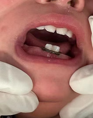 孩子名叫馨馨(化名),是一名1岁多的女宝。6月13日下午,馨馨的爸爸王先生带着孩子在家午睡,怎料馨馨先醒来,就在王先生身上爬来爬去玩耍。“哇哇哇……”突然,王先生被馨馨的一阵哭闹声吵醒,发现孩子既没有摔着也没磕着,正纳闷时,忽然看见孩子张大的嘴巴里,一个金属圈牢牢套在了下排的乳牙上。“我第一反应就是去抠下它,但怎么也扣不下来,我也怕太用力伤了孩子!”王先生回忆道,“不过抠它时我看清了那是我衣服上的拉链头……”怕尖锐的拉链头损伤孩子口腔,于是王先生赶紧带着孩子来到了口腔科寻求医生的帮助。