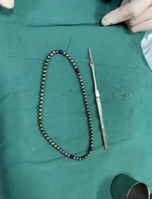 爸爸妈妈看到片子后,再次追问儿子小奇时,他才道出事情原委。原来前一天晚上,小奇洗澡时出于好奇,将磁力珠经尿道口塞入尿道,没想到珠子进去就出不来了。小奇想利用磁力珠的吸力将尿道内的珠子吸出,还把磁力珠吸成一长串以此来增大吸力。结果珠子进入容易出来难,导致越塞越多,最后出现尿痛、血尿等症状,小奇这才告诉妈妈。他们告诉医生,这是儿子自己从网上买来的玩具,珠子是有磁力的,可以吸在一起。他们万万没想到,竟会被他塞进尿道,而且数量还这么大。
