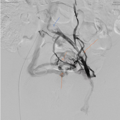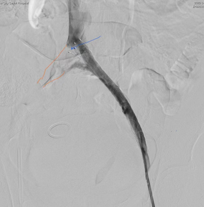 治疗前造影图。图像所示为导管插入到左髂外静脉造影,多支侧支血管开放(橙色箭头所示),左髂总静脉近心端充盈缺损(蓝色箭头处)。