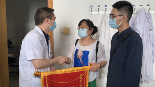 超声科医生办公室,刘阳母子见到了刚刚会诊回来的邱跃文医生,母子俩将一面写有“妙手回春 医德高尚”的锦旗郑重地送到邱跃文手里。曾女士握住邱跃文医生的手,久久不肯松开,激动的泪水在眼眶里打转:“真的感谢,要不是遇到您,我儿子可能就没了,根本不可能好好地站在这里……”