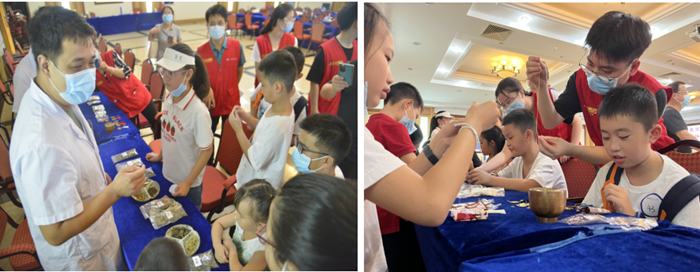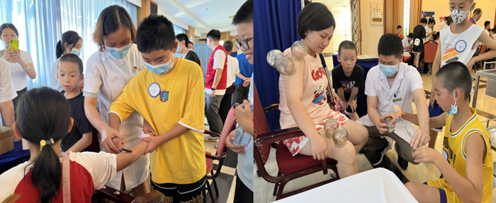 活动现场设刮痧区、拔罐区、香囊制作区,由北院联合、康复医学科党支部,颐和楼、北院团支部等志愿者们进行全程指导孩子们完成相关实践操作。