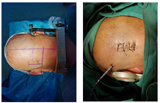 术前手术计划切口,位于枕部 术后切口长约3cm,脑干引流管内可见瘀血