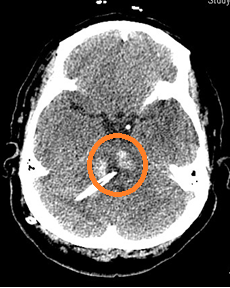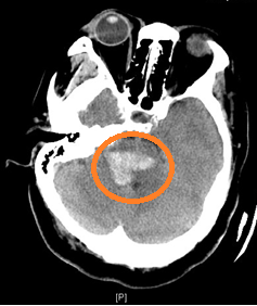 图为CT显示患者大量脑干出血(黄色标注区域)