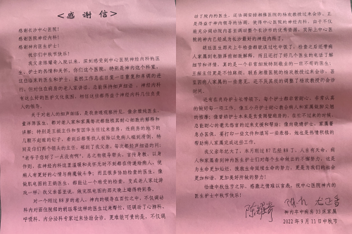 神经内科病房,88岁身患重症肌无力的陈东(化名)老人独自在病房行走做康复锻炼,老人的儿子陈为之(化名)为医护人员送上了一封诚挚的感谢信,感谢在神经内科医护人员的精心医治、细心护理下,老人从入院时视物模糊、行走困难,到出院时能看清事物、独立行走。