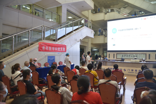 门诊大厅面向市民和病友举办“世界阿尔茨海默病日”主题科普义诊活动,向广大市民说明:“如果家中有阿尔茨海默病患者,学会识别症状,及早干预治疗,可延缓病情发展。”