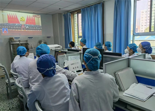 10月16日,儿科党支部的党员们佩戴党员徽章在教研室集体收看中国共产党第二十次全国代表大会开幕直播盛况。当会议开幕,全场起立,一同高唱中华人民共和国国歌,认真聆听习近平总书记所作报告,热烈的掌声一次次响起,所想所感也开始在心中萌生。