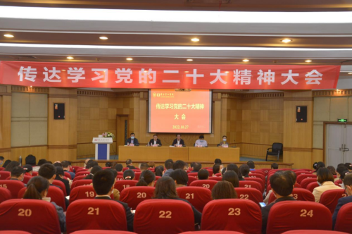 在办公楼一楼国际学术报告厅召开传达学习党的二十大精神大会。会议由党委委员、副院长蔡岳祥主持,全体在院的党委班子成员、党总支和党支部书记以及中层干部参会。党委书记肖玉坤传达学习了二十大精神并讲话。