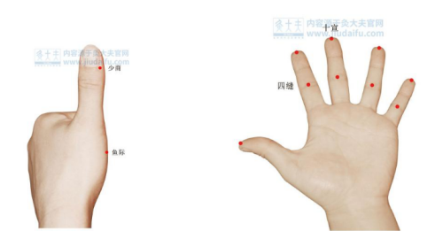 3.少商及十宣穴消毒后点刺放出3到5滴血。(注:居家若无注射针头可用缝衣针高温或酒精浸泡消毒后替代。)