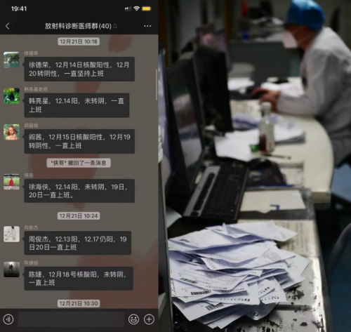放射科诊断医师群,一条条醒目的接龙让人为之动容。据悉,全科90名医护几乎全部感染新冠病毒,但他们依然带病上岗应对高于平时1倍多的工作量,为一个个病人行CT影像检查,从一张张影像里寻找蛛丝马迹,在抗疫后方筑起一道坚不可摧的安全线。