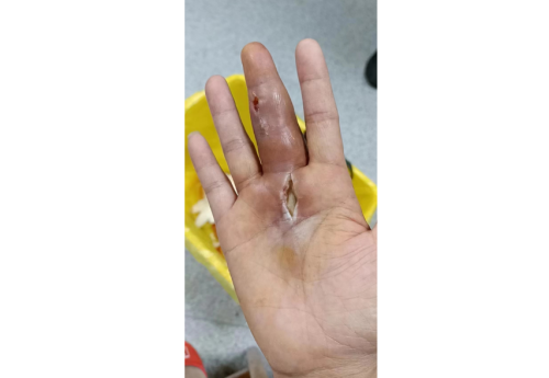 行局部理疗后,疼痛感并没有减轻,右手中指、右手掌开始逐渐肿胀、破溃、流脓,慢慢地丧失了抓握功能。不仅干不了质检工作,连抓筷子,拿手机都成了奢望。