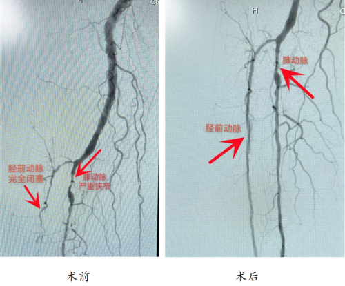 入院后,患者完善检查,CT血管造影(CTA)显示胫前、胫后动脉闭塞,腓动脉多发重度狭窄,需尽快手术打通血管。因患者合并有糖尿病、肾功能不全等慢性基础疾病,给手术带来一定风险。为了确保手术能够安全、顺利地进行,赵扬程带领外周血管介入团队制定了完备的手术方案,详细至投照角度、手术入路、导丝钻入病变的方式等。征得患者及家属同意后,在全麻下实施右下肢动脉球囊扩张成形术,为患者成功开通胫前动脉至足背动脉,行药物球囊扩张,术后足背动脉可触及明显搏动,手术时长两小时。术后,患者苏醒,欣喜地表示右腿的疼痛完全解除了,腿脚也变得暖和。