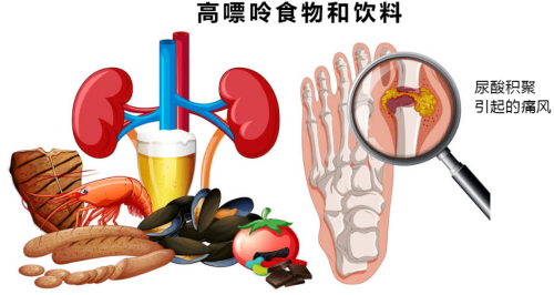 当人体内嘌呤的新陈代谢发生紊乱后,血中过高的尿酸结晶后沉积在骨关节、肾脏和皮下组织中会引发组织病理性改变。如急性关节炎、痛风石、慢性关节炎、关节畸形等。因酒类、海鲜、内脏中含有大量嘌呤,食用过多即可导致血尿酸超标,从而引发痛风。