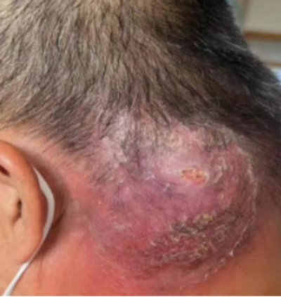 接诊的神经外科李锁南副主任医师仔细查看,发现王先生左侧枕部有一杯口大的头皮脓肿,大小约6.5*4.0cm,皮肤红肿,皮温高,局部有破溃,有少量黄色分泌物流出。经过进一步问诊了解到,王先生有糖尿病病史1年,且未进行治疗。李锁南副主任医师表示,像王先生这样在头皮上长出的“疙瘩”,医学上称之为“疖”,多数由金黄色葡萄球菌感染引起毛囊及周围软组织发生急性脓性炎症,表现为皮肤疼痛、肿胀,伴有黄色脓性分泌物,好发于糖尿病患者、抵抗力低下及中老年人群。
