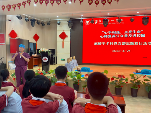 2023年4月21日下午3:30,麻醉手术科党支部受雨花区枫树山明昇小学的邀请来到校园进行“急救知识公众普及培训活动”,为学校老师生们普及急救知识。麻醉手术科党支部书记刘松华同志带着一行党员医护工作者如约而至。
