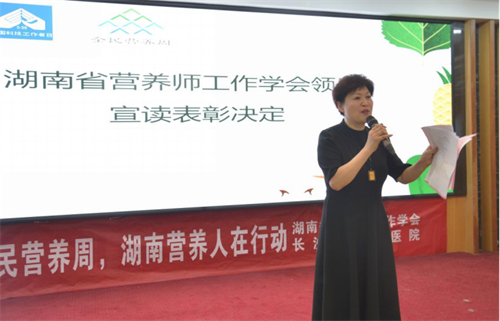 湖南省营养师工作学会党委书记刘爱苹女士宣读在营养科普工作中作出突出贡献的单位的表彰决定,并与各位领导共同颁奖。