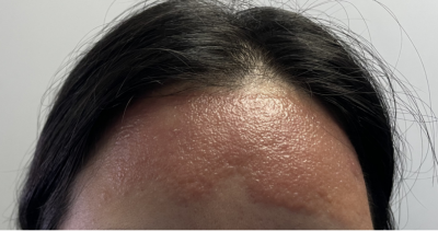 皮肤科就诊,皮肤科主任医师田立红查看发现,患者额头红斑、肿胀、丘疹的区域形状与长方形的“冰凉贴”大小相近,属于皮肤接触外界物质引起的炎症性皮肤病,可以诊断为接触性皮炎。田立红告诉王荧,这是皮肤的过敏反应,嘱咐患者暂停使用“冰凉贴”,给予口服抗过敏药,局部外擦糠酸莫米松软膏和醋酸铅洗剂湿敷等对症治疗。