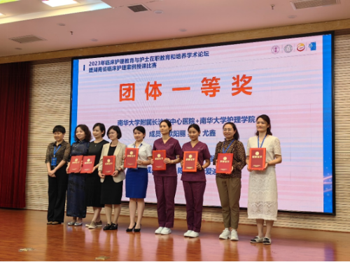 +南华大学护理学院代表团(董启玉、刘畅、吴双、尤鑫、欧阳丽)凭借顺畅的教学展示和生动的教学风格,在15只队伍中脱颖而出,荣获“一等奖”。