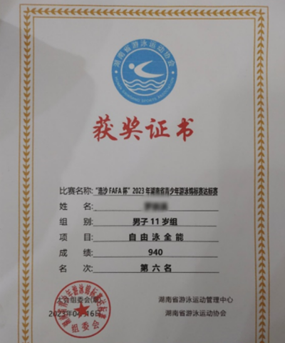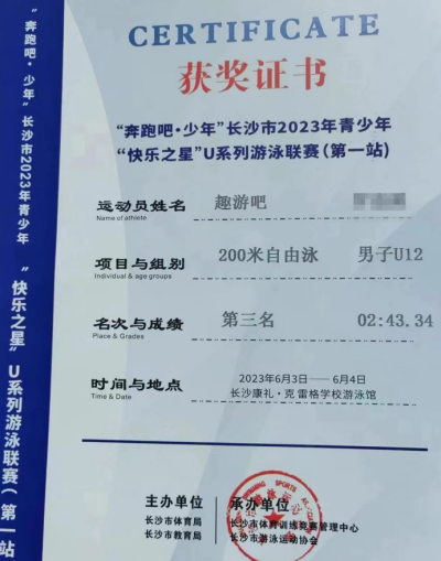 康复训练保驾护航下,小勇今年6月份再次获得“奔跑吧,少年”长沙市2023年青少年“快乐之星”U系列游泳联赛第三名的好成绩!