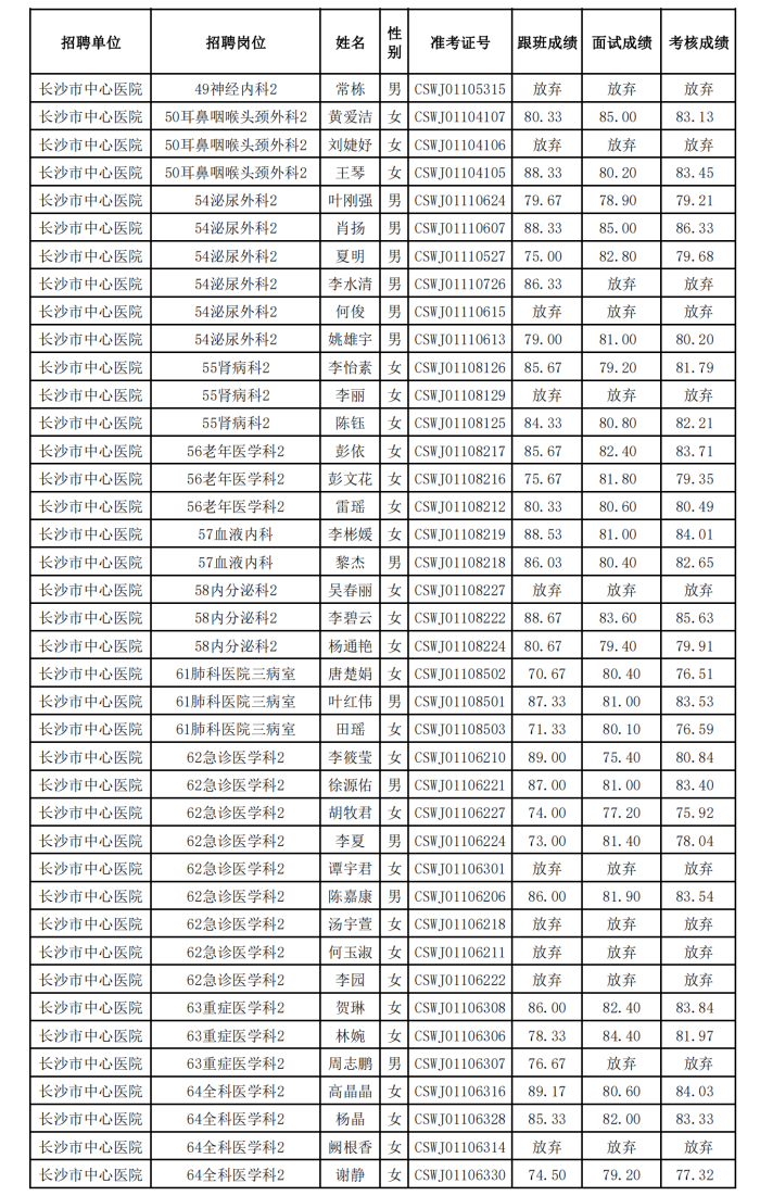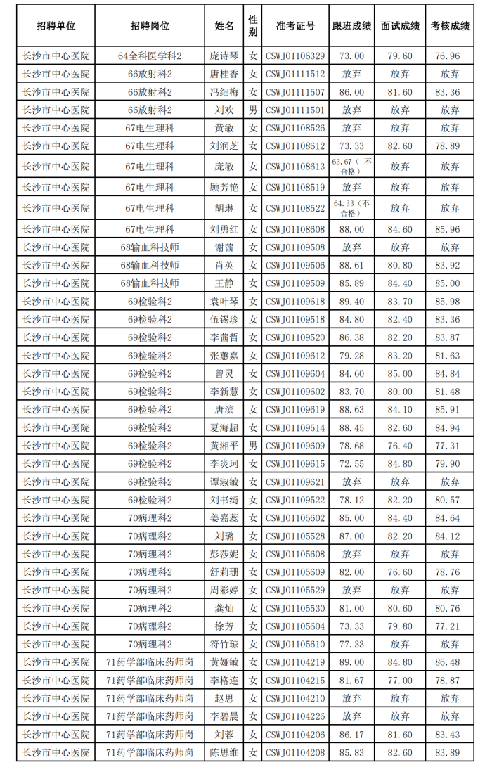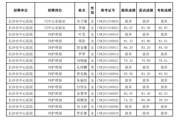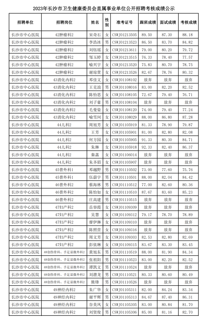 2023年长沙市卫生健康委员会直属事业单位公开招聘考核成绩公示