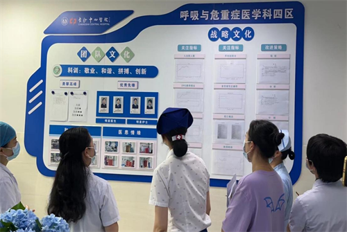 图为科室设计的团队文化及战略文化墙,在科内展示团队文化的同时,随时提醒和关注科室国考指标并不断分析和改进,营造团队积极向上、追求卓越的氛围,得到院领导及验收小组的高度赞扬。