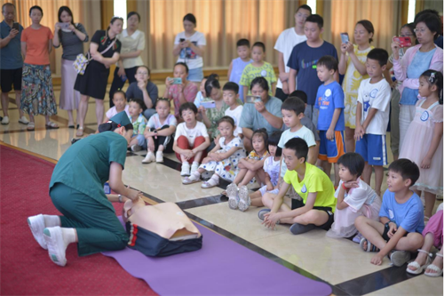 余庆乐通过真实的临床案例告诫学员及家长远离野外危险水域,牢记防溺水安全“六”不准和游水注意事项,学会溺水施救和溺水自救。随后,现场采取情景教学的形式,由护士示范心肺复苏急救要领,带领学员及家长沉浸式体验溺水急救现场,小学员们都在认真听课并踊跃举手回答问题。