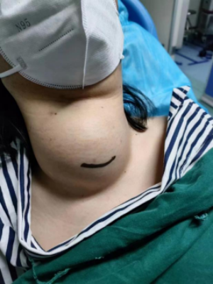 就医,医生发现,简女士的甲状腺肿大达10cm,气管最狭窄处仅约6mm左右!巨大的肿块已经“掐”住了她的气管致呼吸受阻。