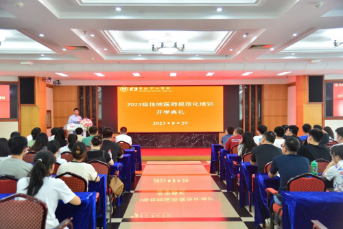 办公楼二楼多功能厅举行,2023级99名住培生及并轨专硕研究生参加了典礼仪式。会议由科教科石哲科长主持,陈智毅院长出席了本次开学典礼。
