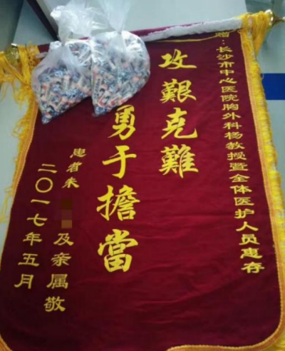 2017年5月16日,手术4个月后,朱爷爷已经可以生活自理,走路步伐矫健。他亲自带着一副定制的“攻坚克难,勇于担当”的锦旗来到胸外科、心脏大血管外科感谢救死扶伤的手术医生,还带了两大包“大白兔奶糖”来感谢如孙女一般的护士们。